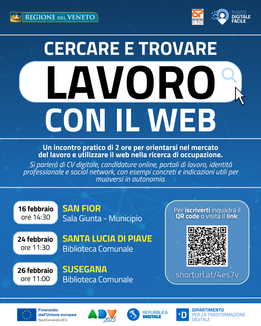 Nell'ambito delle attività in-formative dei Punti Digitale Facile il Comuni aderenti, in collaborazione con la Regione del Veneto, promuove una serie di incontri pratici dedicati a chi desidera orientarsi con successo nel mercato del lavoro digitale.