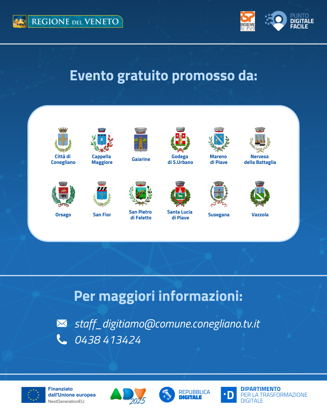 Per ulteriori informazioni, è possibile contattare lo staff all'indirizzo email staff_digitiamo@comune.conegliano.tv.it, chiamare il numero 0438 413424 oppure rivolgendosi al Punto Digitale Facile più vicino, che nel nostro Comune è presso la Biblioteca.